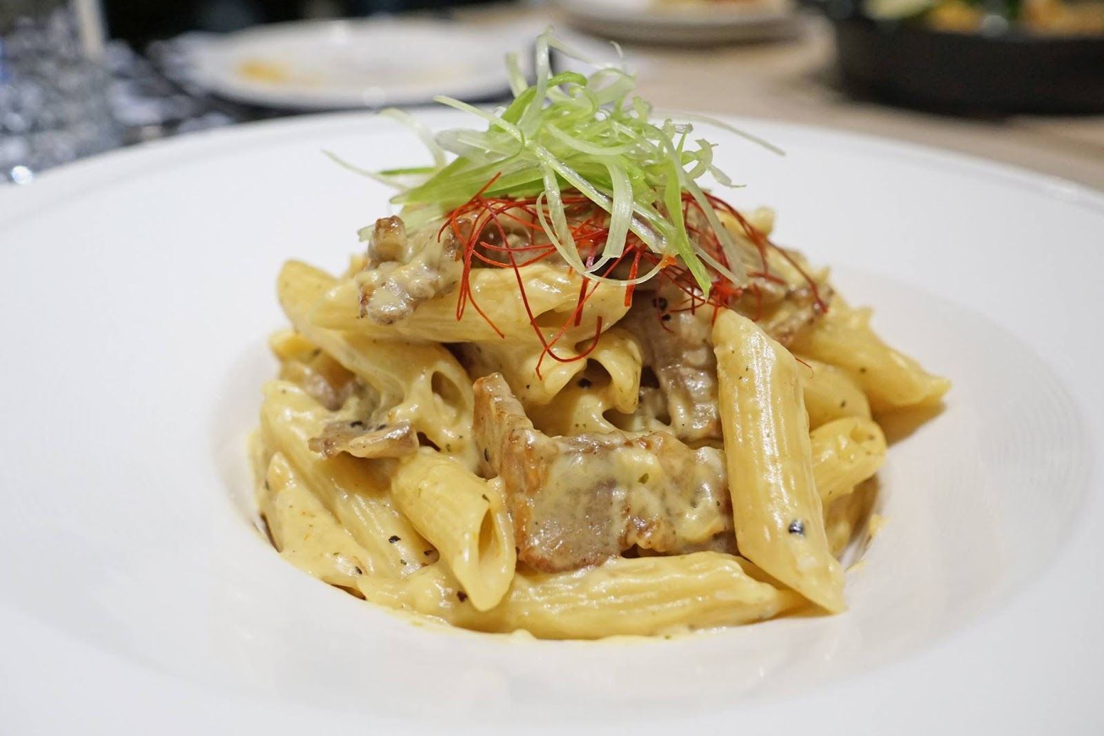 濃郁的奶香白醬和彈牙的的鹹豬肉真的很搭,讓人一口接一口。