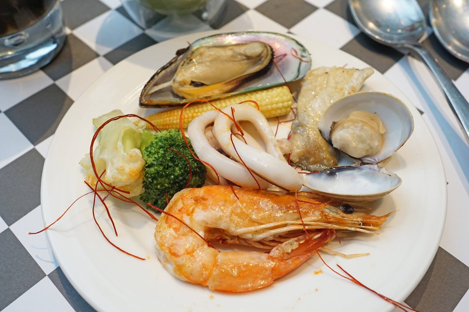 有花椰菜、玉米筍、干貝、鮮蝦、鱸魚、孔雀蛤、蛤蜊、墨魚。