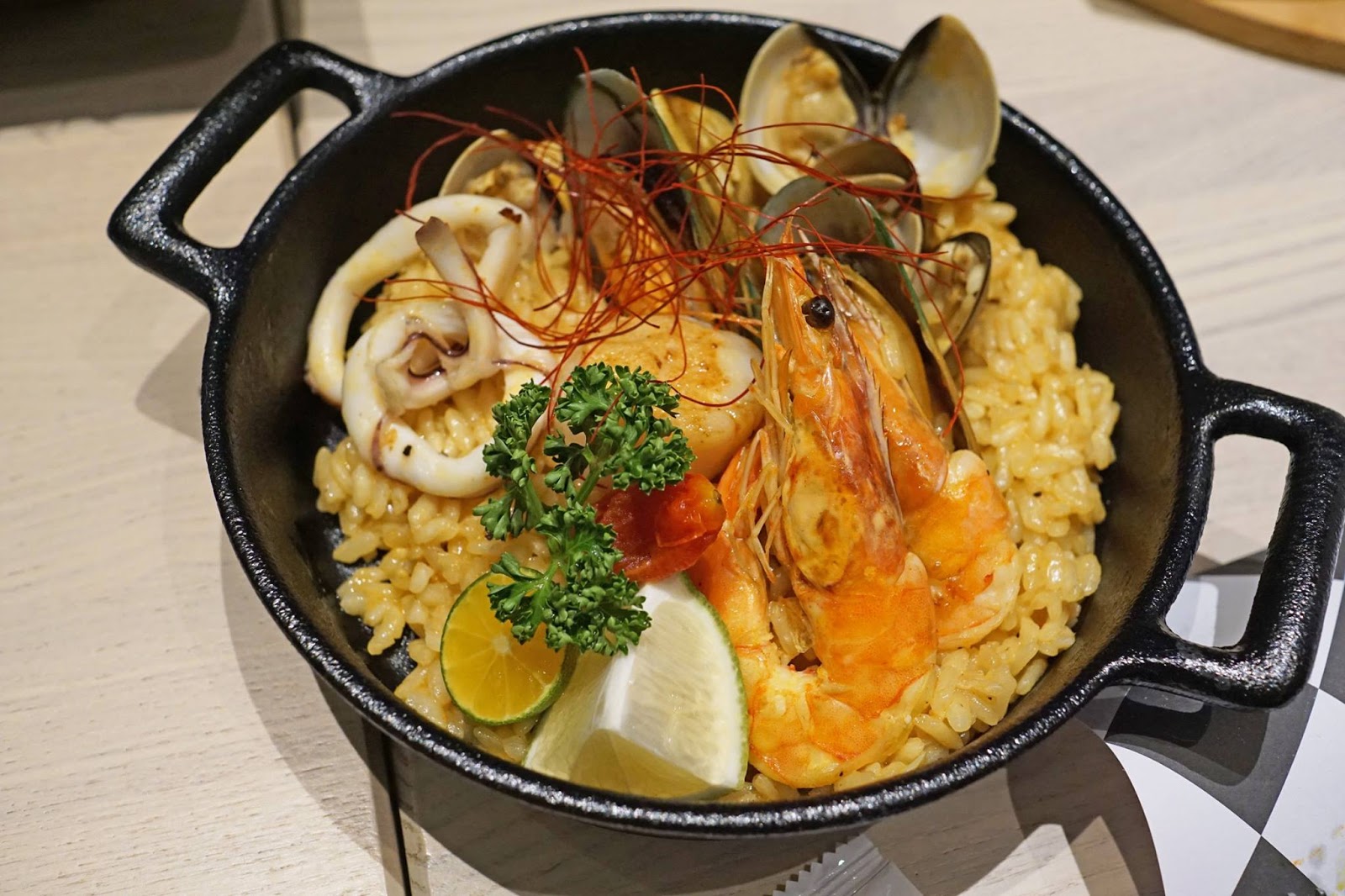 有干貝、鮮蝦、墨魚、孔雀蛤、蛤蜊,每一種的味道都很鮮美並具有彈性。米飯的部份採用義大利正統的方式料理,不僅粒粒分明,中心還有一點硬度,而且調味也很好,一邊吃美味的海鮮、一邊吃入味的燉飯,感覺很享受。