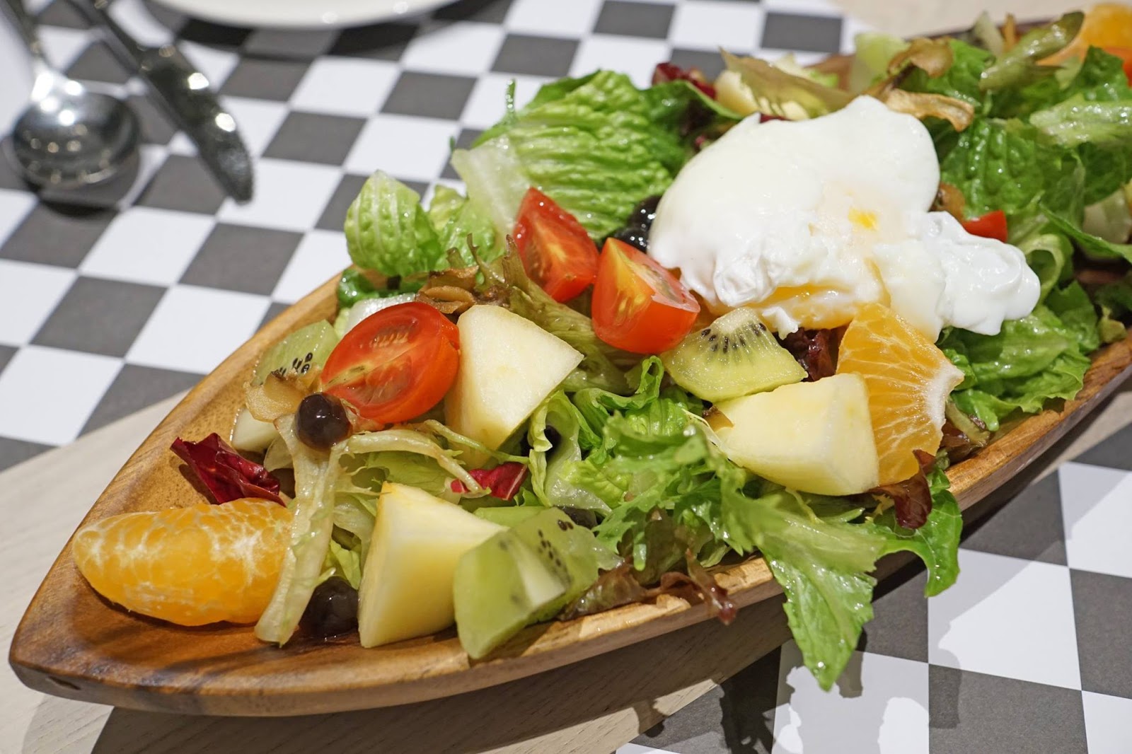 船形的木盤上裝著滿滿的沙拉,讓人感覺很豐盛,除了有脆脆的蘿蔓生菜、甜甜的水果(約4種)、香香的野菇松露、嫩嫩的水波蛋之外,居然還有珍珠!在生菜之中增添Q彈的口感,我第一次遇到這種組合,感覺蠻新鮮的。