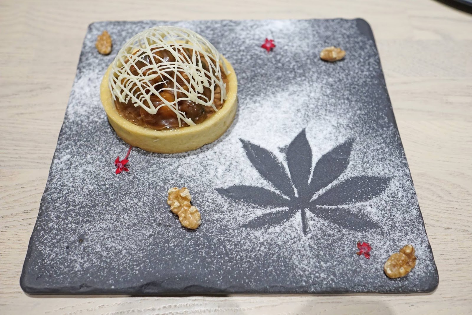 以香酥的塔皮做為基底,然後倒入78%的比利時巧克力,再放入伴著焦糖的堅果(4種),最後小心翼翼蓋上塑型好的白巧克力就大功告成了,看起來就像觀星台一樣,很吸引眾人的目光,是一道考驗師傅功力的甜點,口感香脆的焦糖堅果和苦中帶甜的巧克力,隨著咀嚼,味道漸漸融合,相當好吃。