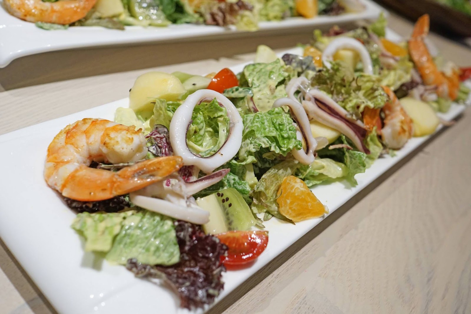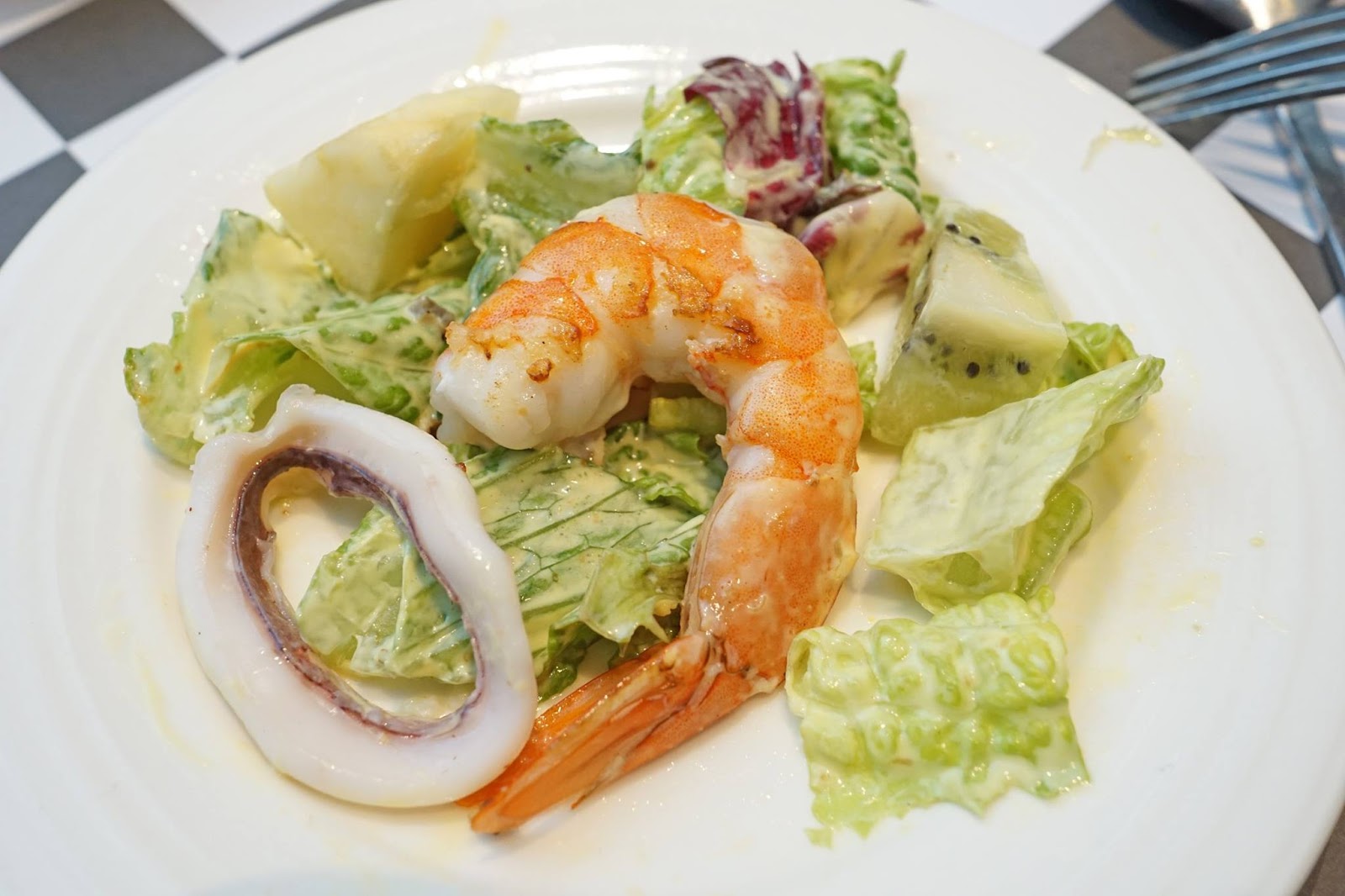 有香甜的水果、清脆的生菜、新鮮的蝦子、Q彈的墨魚,搭配凱薩醬一起吃,味道很好。