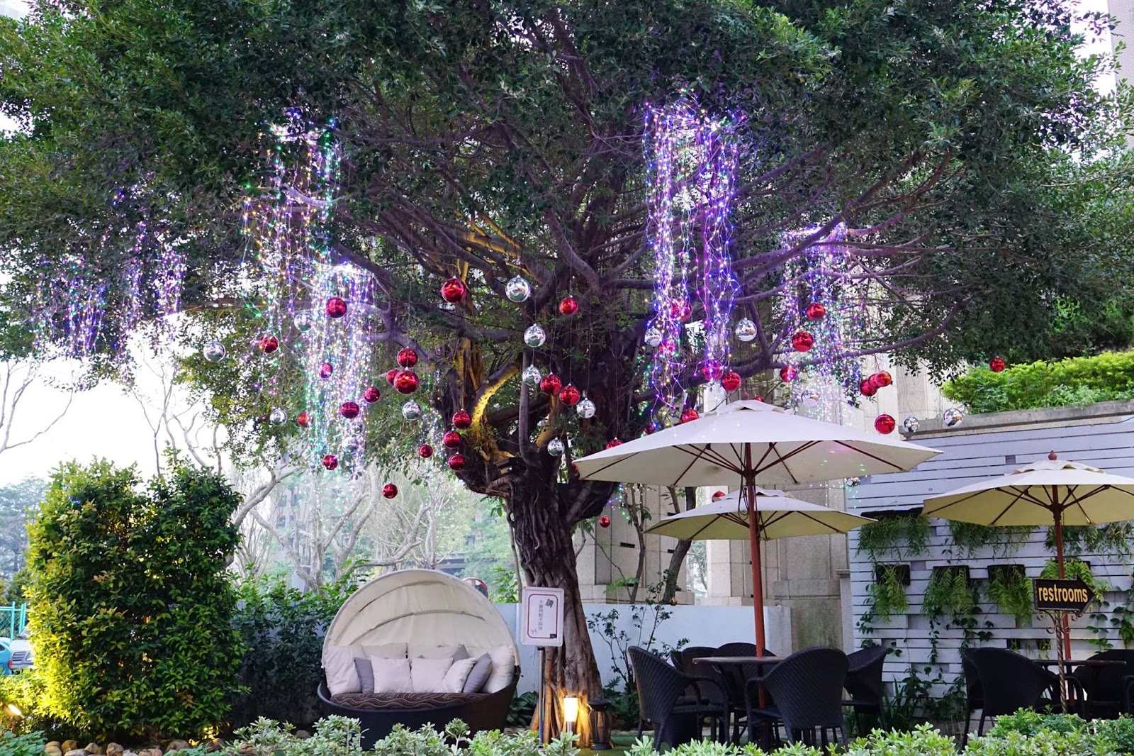 ▲這顆大樹就像是一把傘一樣,讓底下的人可以遮陽避雨,不僅如此,樹上還懸掛著許多裝飾和燈飾,顯得相當美麗,不禁令人多看幾眼。