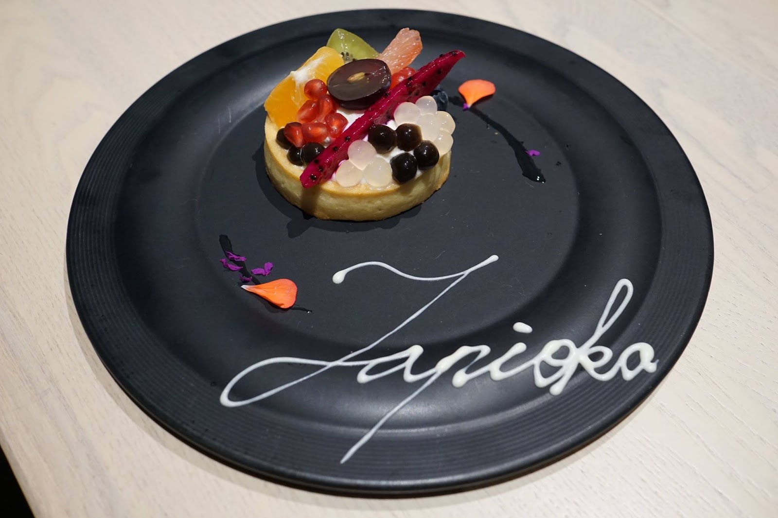 以香酥的塔皮做為基底,中間放入微酸微甜的檸檬餡,再擺上當季新鮮多汁的水果、以及彈牙的黑白珍珠,多種口感混合,香甜好吃。