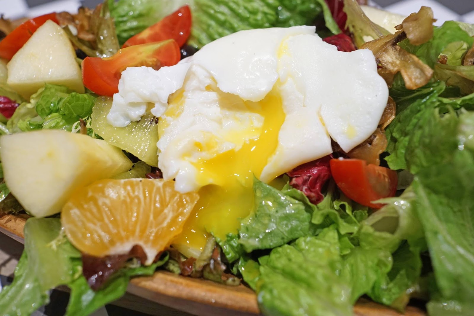 ▲切開水波蛋之後,蛋黃液馬上就流下來,生菜有了蛋香味,感覺也不錯。