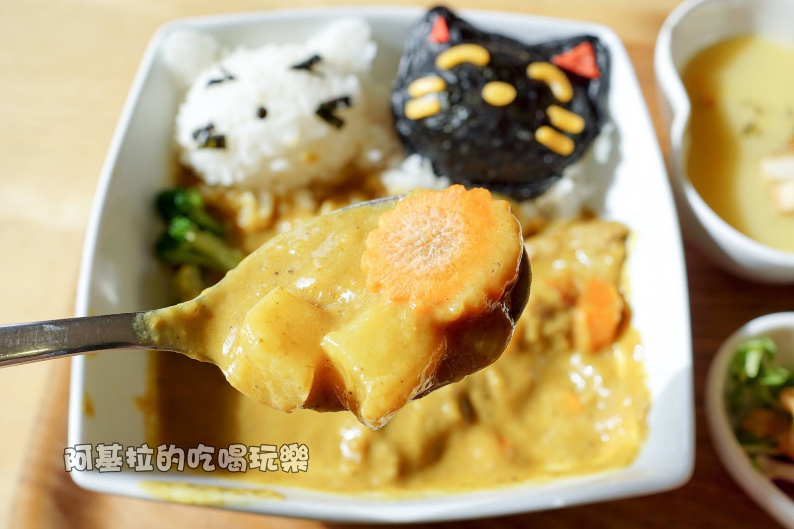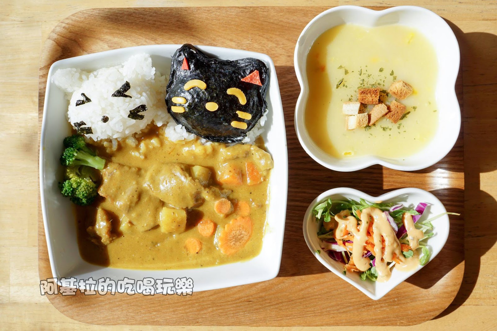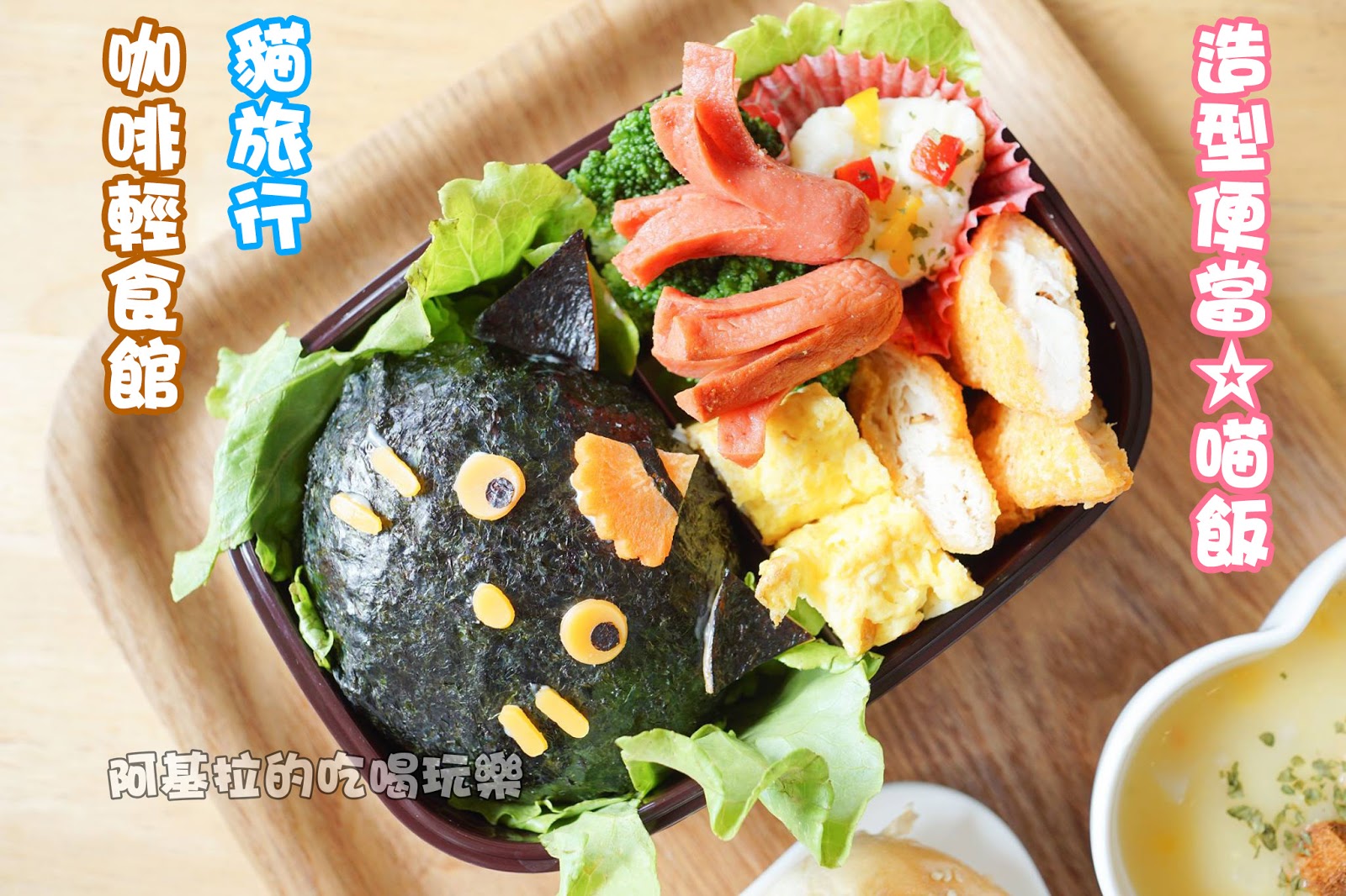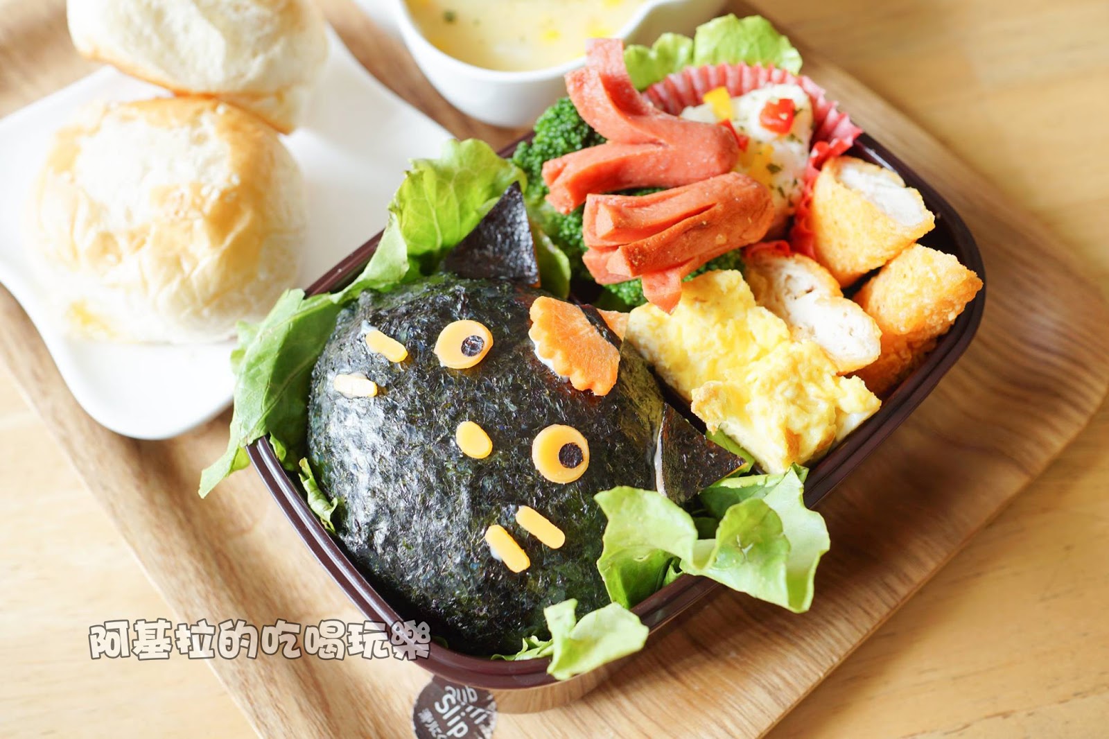 ▲白飯的造型是兩個貓咪的臉,採用海苔和起司製作而成,可愛的模樣令人捨不得吃掉。