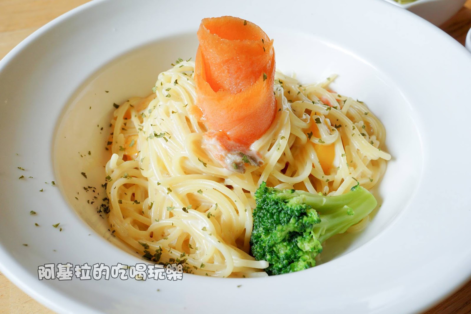 ▲醬料的味道是奶油白醬,味道很香濃,口感不會過乾,搭配軟硬度適中的麵條,以及煙燻鮭魚肉,好吃無可挑剔。