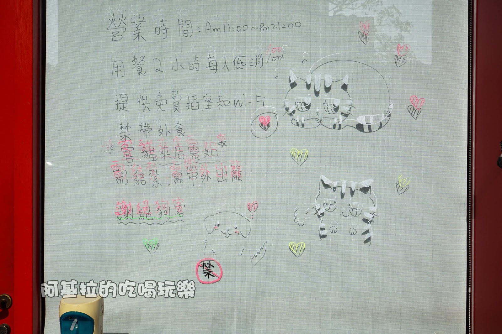 ▲窗戶上寫著「每人低消100元、禁帶外食、提供免費插座和Wi-Fi、謝絕狗客、客貓需已結紮並攜帶外出籠」,後面兩項規定是為了保護店貓,各位可要注意一下。